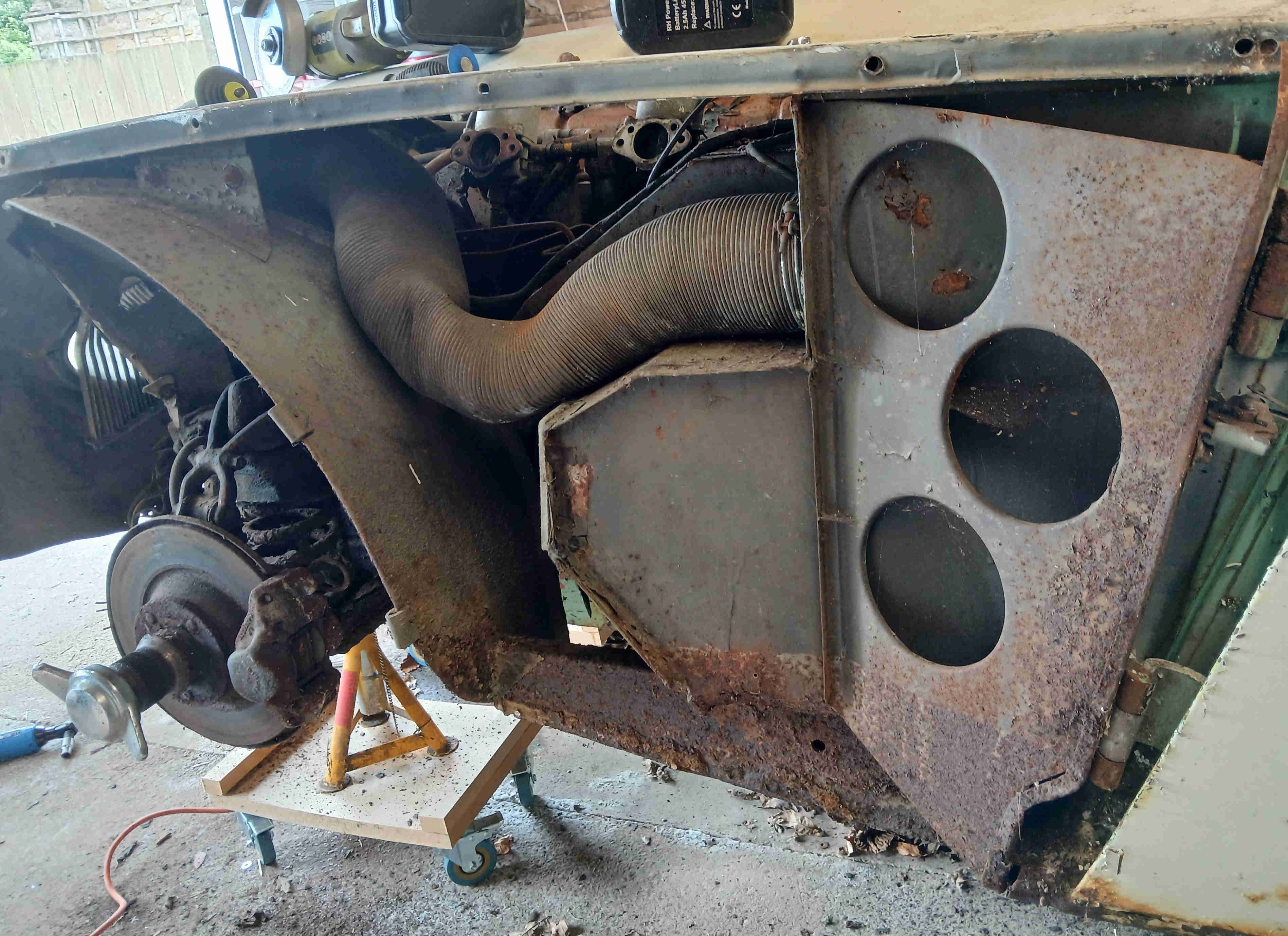 On to the rear shroud. This made from aluminium so is rivetted on with a combination of pop rivets and plain aluminium rivets. Just a case of drilling those out and off it comes. This revealed the true extent of the rot in the boot.